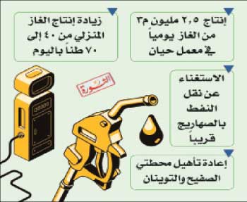 وبالنسبة للغاز المنزلي فقد تم إجراء بعض التعديلات الفنية في معمل غاز جنوب المنطقة الوسطى لإنتاج الغاز المنزلي من غاز حيان حيث يتم معالجة غاز حيان في معمل جنوب الوسطى وقد أدى ذلك إلى زيادة إنتاج الغاز المنزلي من 40 طناً باليوم إلى 70 طناً باليوم.