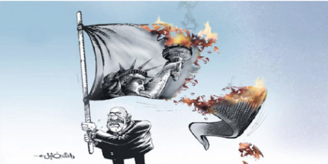 واستناداً إلى روحية الموضوع المطلوب «التمزق والانشطار» سلطت لوحة خليل الضوء بصورة رمزية على من يروجون للدعاية الأمريكية ونشر أفكارها بينما هي في جوهرها تحرق المتلطين بها.