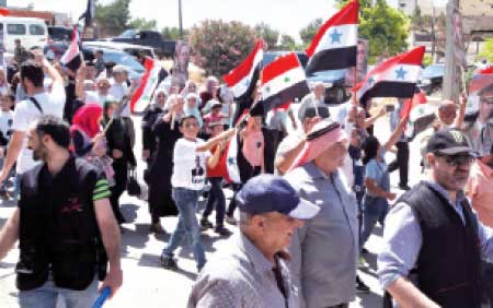 العائدون الذين أقلتهم حافلات أمنتها المحافظة وسيارات خاصة إلى المدينة ساروا في شوارعها حاملين راية الوطن وصور السيد الرئيس بشار الأسد والفرحة تنضح من وجوههم لعودتهم الميمونة الآمنة بعد سنوات من التهجير نتيجة اعتداءات التنظيمات الإرهابية قبل اندحارها منها.