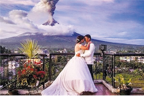 تحدى شاب وشابة من الفلبين كافة الظروف بعد أن قاما بالمضي قدماً في إتمام مراسم زفافهما على الرغم من ثوران بركان بالقرب منهما، حيث قام العروسان بإتمام مراسم الزواج على بعد ما يقل عن 10 أميال من البركان «تال» حيث قام المصور بالتقاط صور مثيرة للزوجين الجديدين وبدت في الخلفية الحمم والرماد البركاني.