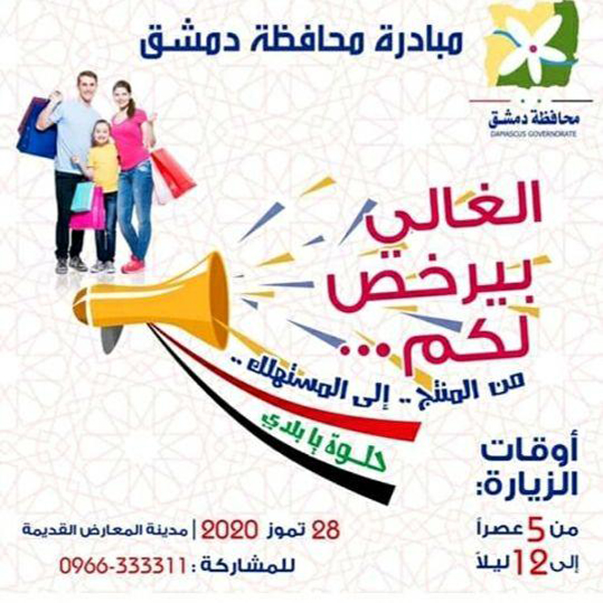تقيم محافظة دمشق مهرجان “الغالي بيرخص لكم” للتسوق، حيث تتم فيه عملية البيع من المنتج إلى المستهلك بشكل مباشر اعتباراً من 28 تموز 2020 ولمدة شهر على أرض مدينة المعارض القديمة، حيث تبدأ أوقات الزيارة لفعاليات المهرجان من الساعة 5 عصراً حتى 12 ليلاً.