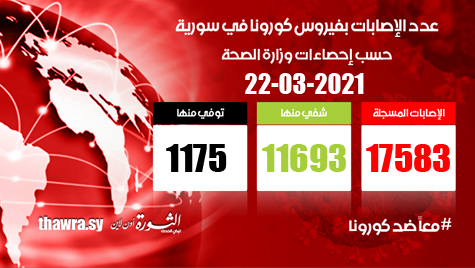 وسجلت أول إصابة بفيروس كورونا في سورية في الثاني والعشرين من آذار من العام الماضي لشخص قادم من خارج البلاد في حين تم تسجيل أول حالة وفاة في التاسع والعشرين من الشهر ذاته.