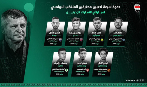 وقال المدير الإداري للأولمبي العراقي جليل صالح: 7 لاعبين محترفين سيحضرون في مباراتي منتخب الإمارات الوديتين. المدرب كان لديه 15 لاعباً محترفاً في حساباته للوجود مع المنتخب خلال الاستحقاقات المقبلة.وأضاف : اللاعبون السبعة هم: الحارس نديم عمر (فالكينبيري السويدي)، ومتين صالح (بروندبي الدانماركي) تحت 21 عاما، ويوهان زيتونه (أتلانتي المكسيكي)، وحسن صادق موسى (الخريطيات القطري) وزيدان إقبال (مانشستر يونايتد) تحت 23 عاماً، وهيران أحمد ( ثون السويسري)، ويوسف زيتونه (أبولنيا الألباني).