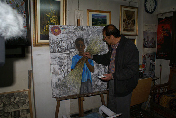 وإذا كان في لوحاته التي قدمها في السبعينات والثمانينات قد اعتمد تقنية الرسم الزيتي بأسلوب تبسيطي في التعبير عن حياة الغربة والاقتلاع. فإنه ومنذ التسعينات ركز لإظهار مقدرته على الرسم الواقعي الدقيق، والكشف عن قدرات تراثية هامة كان لها الصدى القوي لدى هواة اقتناء الأعمال الفنية، داخل سورية وخارجها، بالأخص بعد اهتمامه المطلق بمعطيات الفن الشعبي (خط وزخارف ورسوم مستعادة مع معطيات المهن أو الحرف اليدوية) ولقد كرس مجمل أعمال محترفة، لتمجيد وإطلاق وصياغة تلك الأشكال التي منحته في العقود الأخيرة سمعة طيبة، إذ استطاع إلغاء الحاجز القائم بين الفن التشكيلي والجمهور وبالتالي نجح في تقريب لوحته من الناس.