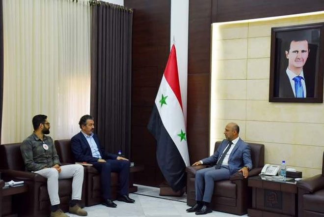 بحث محافظ حمص المهندس نمير مخلوف مع ستيفان بيير ساكاليان رئيس بعثة اللجنة الدولية للصليب الأحمر في سورية والوفد المرافق، سبل تعزيز التعاون المشترك بين الجانبين في المجال الإنساني والإغاثي.