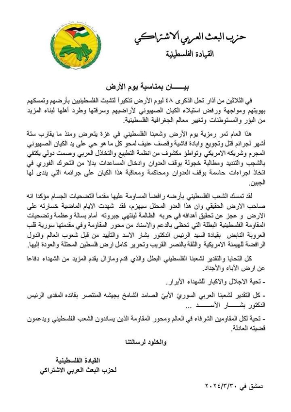 أكدت القيادة الفلسطينية لحزب البعث العربي الاشتراكي أن الذكرى الثامنة والأربعين ليوم الأرض تجديد تشبث الشعب الفلسطيني بأرضه وتمسكه بهويته ومواجهة الاحتلال ورفض ممارساته لطرد أبناء هذا الشعب من أرضه وبناء المزيد من المستوطنات وتهويد المقدسات الفلسطينية.