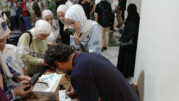ومن أبرز الفعاليات التي شهدها الجناح، إقامة ورشات عمل تفاعلية مباشرة مع الجمهور، حيث شارك الأستاذ أحمد كمال طلابه في تقديم لوحات فنية بالخط العربي، كُتبت على القماش والورق المقوى، وجرى إهداؤها لزوار المعرض.