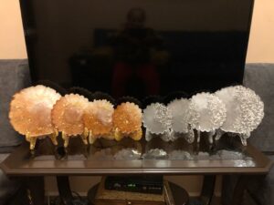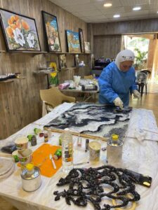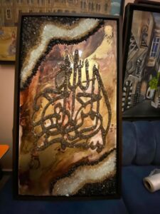 وفيما يتعلق بإعادة تدوير النفايات، قالت: أعددت لوحة نباتية مصنوعة من قشر البيض تجسد الإتقان اليدوي عبر لوحة فسيفساء، كما تحدثت عن استخدام مادة الإبوكسي، التي كانت في البداية تُستخدم كمادة لاصقة، لكنها الآن تُستخدم في الأشكال ضمن قوالب أو لإنجاز اللوحات، مع إضافة الألوان والأحجار حسب الذوق، لتخرج قطعة فنية مميزة، كذلك قامت بعمل لوحات قرآنية جدارية بتصميم مستوحى من الفن الإسلامي، مشيرةً إلى أن لوحات الإبوكسي تتسم بالبروز والوضوح المميز.