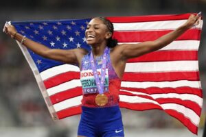 وختتمت الأميركية ميليسا جيفرسون وودن، موسمها المهيمن بفوزها بسباق (100 متر) عدواً للسيدات، مسجلة رقماً قياسياً للبطولة بلغ (10,61) ثوانٍ، وحصلت تينا كلايتون على الميدالية الفضية لجامايكا، مسجلة أفضل زمن شخصي لها وهو (10,76) ثوانٍ، بينما ذهبت الميدالية البرونزية إلى البطلة الأولمبية جوليان ألفريد من سانت لوسيا، مسجلة (10,84) ثوانٍ، وفي آخر نهائي فردي لها قبل اعتزالها في سن الثامنة والثلاثين، سجّلت الأسطورة الجامايكية شيلي آن فريزر – برايس، بطلة العالم خمس مرات توالياً، سادس أسرع زمن خلف حاملة اللقب الأميركية شاكاري ريتشاردسون.