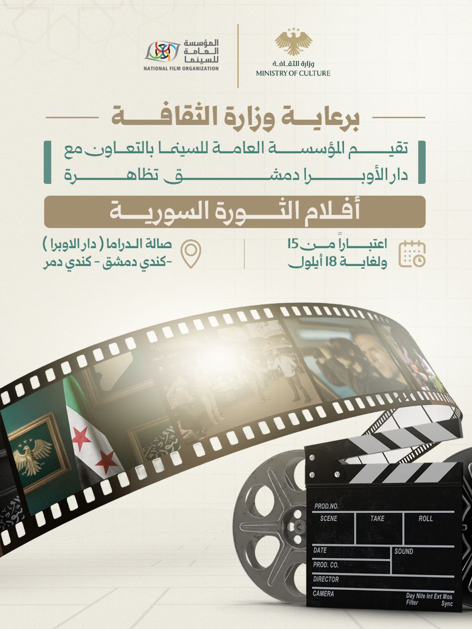 تُفتتح مساء اليوم عروض تظاهرة “أفلام الثورة السورية” في قاعة الدراما بدار أوبرا دمشق، تحت رعاية وزارة الثقافة وبتنظيم من المؤسسة العامة للسينما، وسيكون فيلم الافتتاح للمخرجة سؤدد كنعان بعنوان “نزوح”.