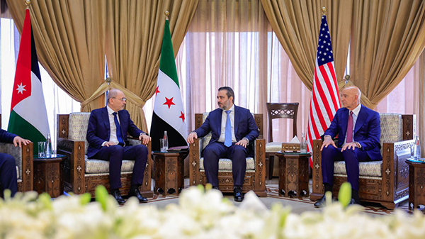 استضافت العاصمة السورية دمشق اجتماعاً ثلاثياً ضمّ وزير الخارجية والمغتربين أسعد حسن الشيباني، ونائب رئيس مجلس الوزراء وزير الخارجية الأردني أيمن الصفدي، والمبعوث الأمريكي الخاص إلى سوريا توماس باراك، جرى خلاله عرض الخطوات العملية المتفق عليها لتجاوز تداعيات أحداث السويداء وإعادة الاستقرار إلى المحافظة.