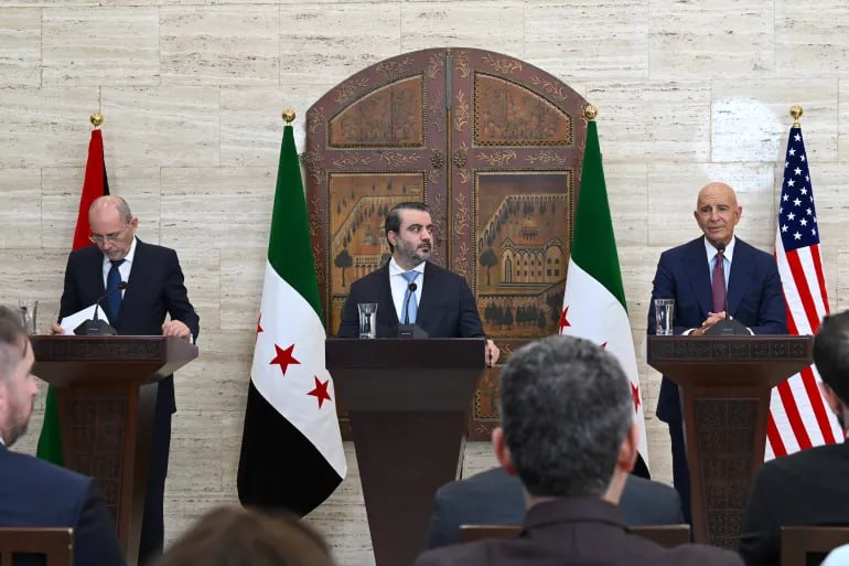 وعقب استضافة سوريا اجتماعاً ثلاثياً أمس ضمّ وزير الخارجية والمغتربين أسعد الشيباني، ونائب رئيس مجلس الوزراء وزير الخارجية الأردني أيمن الصفدي، والمبعوث الأميركي الخاص إلى سوريا توماس باراك، جرى خلاله عرض الخطوات العملية المتفق عليها لتجاوز تداعيات أحداث السويداء وإعادة الاستقرار إلى المحافظة، أعلن الشيباني في مؤتمر صحفي أنّ الحكومة السورية أعدت بهذا الصدد خارطة طريق واضحة للعمل تكفل الحقوق وتدعم العدالة وتفتح الطريق أمام الصلح المجتمعي، وتتضمن سبع خطوات عملية بدعم من الأردن والولايات المتحدة.