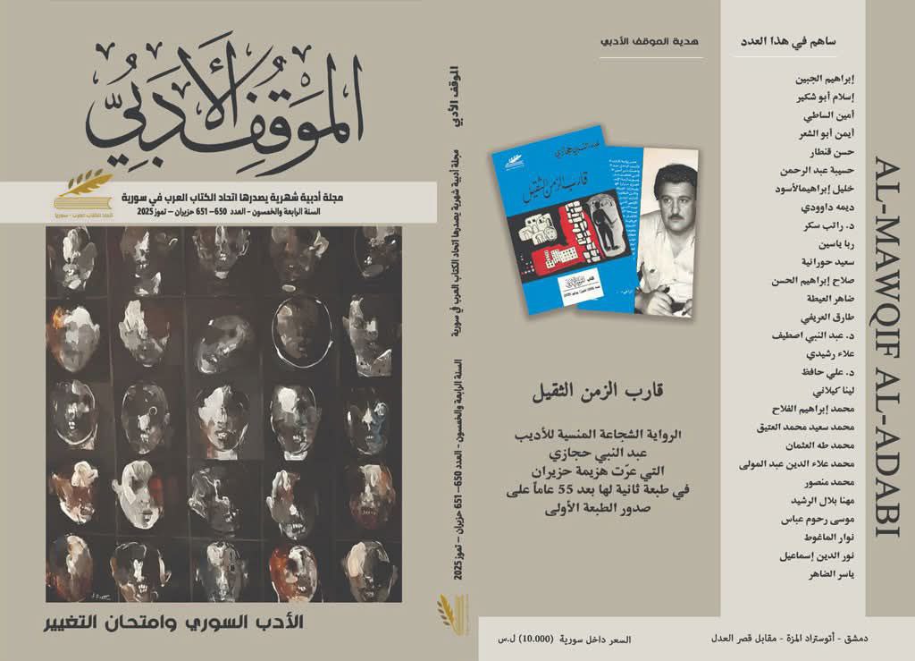 خصص العدد الجديد من مجلة “الموقف الأدبي” الشهرية الصادرة عن اتحاد الكتّاب العرب بدمشق، “الأدب السوري وامتحان التغيير”، كما جاء في عنوان الغلاف، الذي تصدرته لوحة الفنان أسعد فرزات، “وجوه قيصر”، وقد كتب على غلاف العدد الرواية الشجاعة المنسية للأديب عبد النبي حجازي التي عرّت الهزيمة حزيران في طبعة ثانية لها بعد خمسة وخمسين عاماً على صدور الطبعة الأولى.