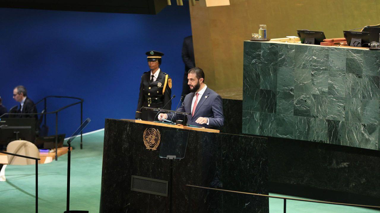 ألقى السيد الرئيس أحمد الشرع اليوم خطاباً تاريخياً على منبر الجمعية العامة للأمم المتحدة بعد انقطاع الحضور السوري والتمثيل الدبلوماسي الرئاسي لنحو ستة عقود تقربياً، تناول فيه ملامح السياسة السورية داخلياً وخارجياً ورسم سياسة الدولة السورية ضمن طيات خطابه، مركزاً على التعايش السلمي والتكاتف الشعبي بين مكونات الشعب السوري، مؤكداً على تعزيز مبدأ التشاركية، ومطالباً المجتمع الدولي بتحمل مسؤولياته، بضرورة رفع العقوبات الاقتصادية عن كاهل الشعب السوري بشكل كامل، داعياً إلى المحافظة على وحدة الأراضي السورية، ومنع تقسيم البلاد وإزالة النعرات الطائفية الداعية للانفصال والتقسيم، منطلقاً في بداية كلمته بقوله “جئتكم من دمشق مهد الحضارات وعاصمة التاريخ”.