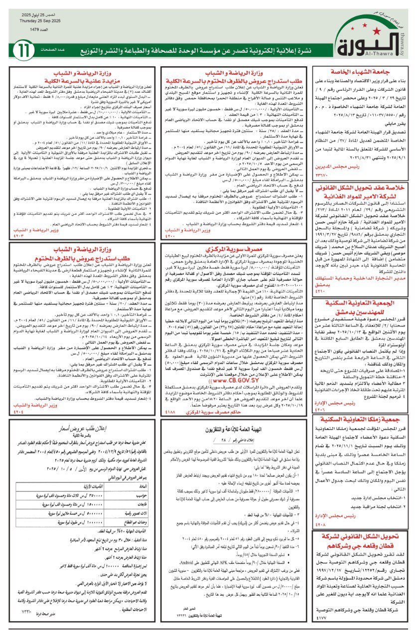 اعلانات العدد 1479 الاعلانات pdf # صحيفة الثورة في 25 سبتمبر , 2025 بتوقيت دمشـــق Loading... Taking too long? Reload document | Open in new tab تحميل العدد كاملاً [3.95 MB] مشاركة المقال: FacebookTwitterWhatsAppTelegramFacebook MessengerLinkedinطباعة