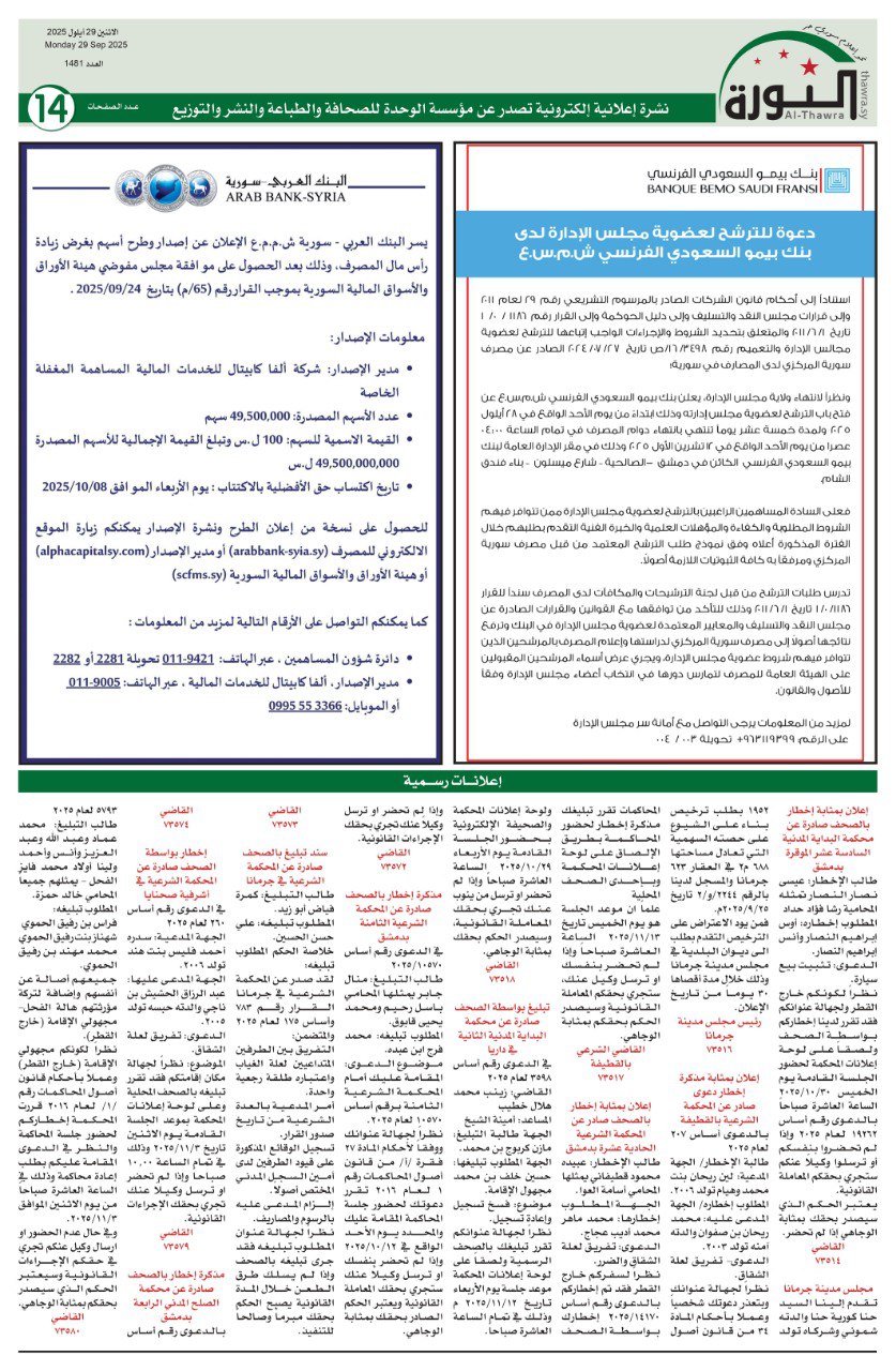 اعلانات العدد 1481 الاعلانات pdf # صحيفة الثورة في 29 سبتمبر , 2025 بتوقيت دمشـــق Loading... Taking too long? Reload document | Open in new tab تحميل العدد كاملاً [5.46 MB] مشاركة المقال: FacebookTwitterWhatsAppTelegramFacebook MessengerLinkedinطباعة