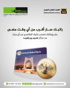 وأضاف في بيان له: إنه وبعد إتمام التحديث، يمكن للمتقاعد حامل بطاقة المصرف التجاري السوري سحب الأموال مباشرة من مراكز شركة الهرم، وذلك من خلال:- إبراز البطاقة المصرفية والهوية الشخصية لموظف الشركة، وقيام موظف الهرم بإدخال البيانات الخاصة بالمتقاعد (الاسم، رقم البطاقة المصرفية، ورقم الهاتف المحمول). كما يجب أن يتطابق رقم الهاتف المُصرَّح عنه مع الرقم المُسجَّل في بيانات المصرف التجاري السوري.