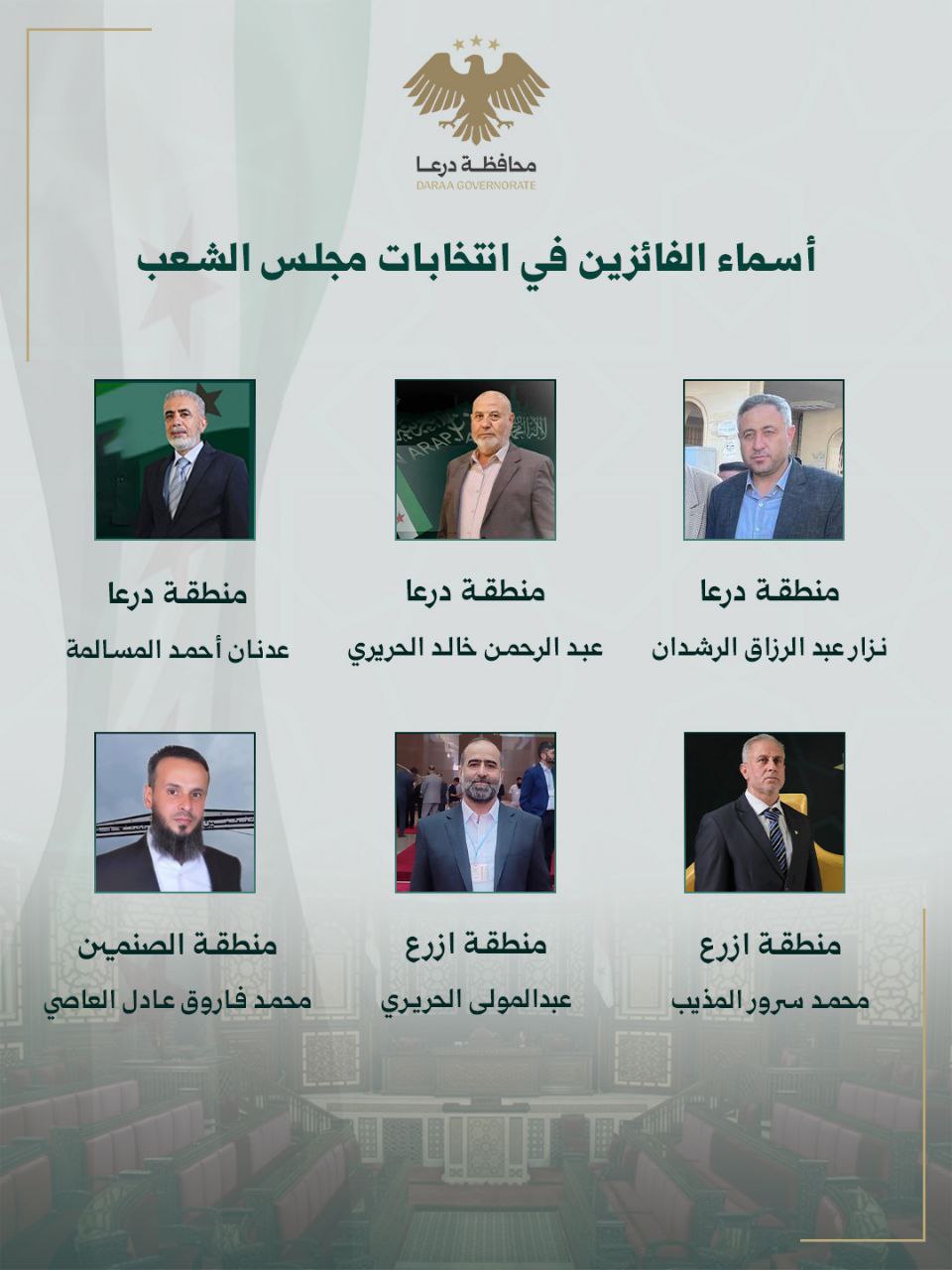 أصدرت اللجنة الفرعية لانتخابات مجلس الشعب في درعا أسماء الفائزين في المحافظة، وهم: نزار عبد الرزاق الرشدان، وعبد الرحمن خالد الحريري، وعدنان أحمد المسالمة، ومحمد سرور المذيب، وعبد المولى الحريري، ومحمد فاروق عادل العاصي.