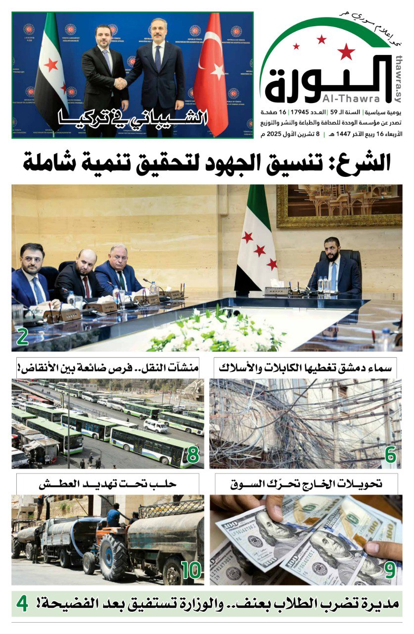 صحيفة الثورة العدد17945 الصحيفة PDF # صحيفة الثورة في 8 أكتوبر , 2025 بتوقيت دمشـــق Loading... Taking too long? Reload document | Open in new tab تحميل العدد كاملاً [3.34 MB] مشاركة المقال: FacebookTwitterWhatsAppTelegramFacebook MessengerLinkedinطباعة