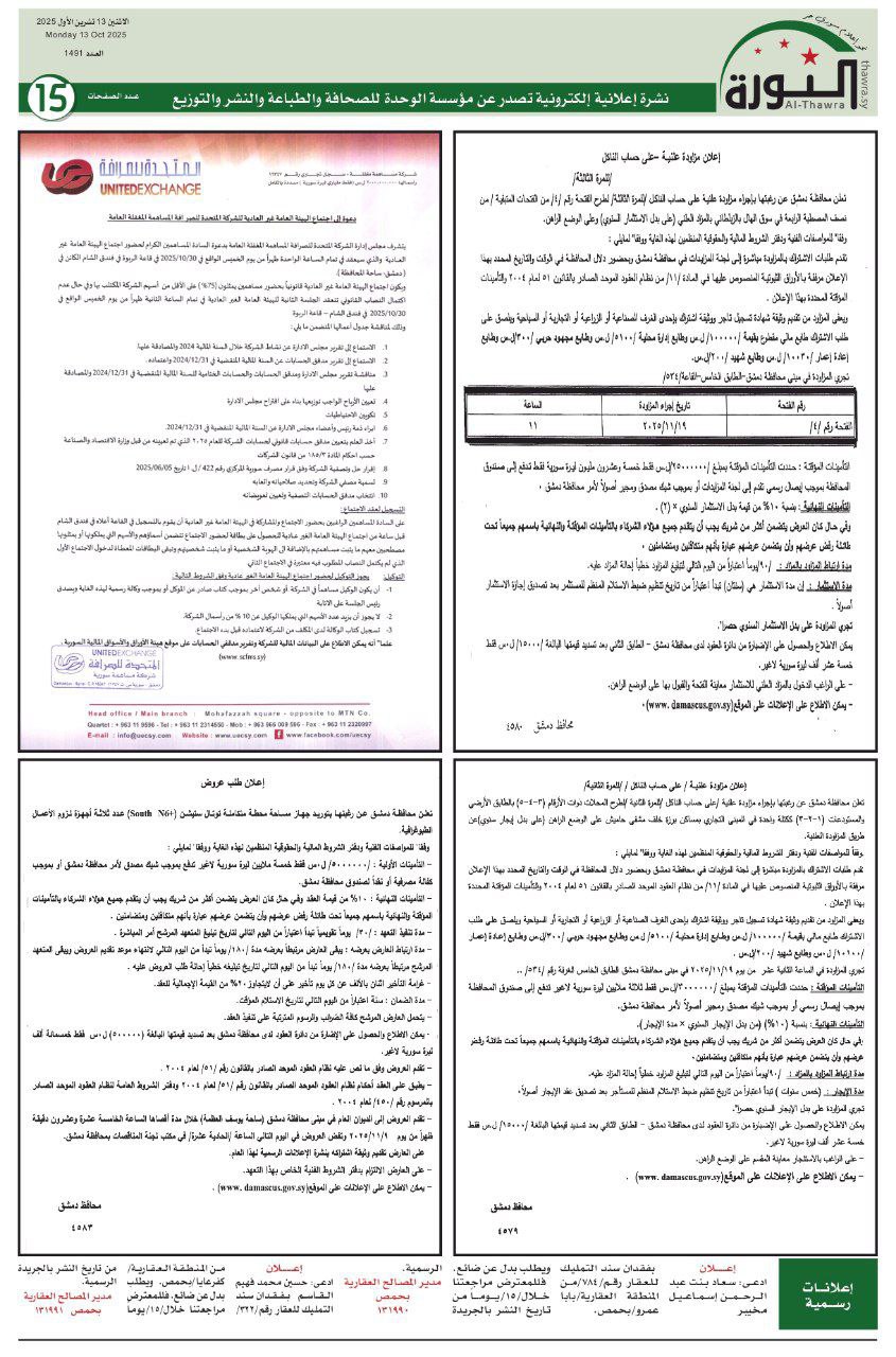 اعلانات العدد 1491 الاعلانات pdf # صحيفة الثورة في 13 أكتوبر , 2025 بتوقيت دمشـــق Loading... Taking too long? Reload document | Open in new tab تحميل العدد كاملاً [8.58 MB] مشاركة المقال: FacebookTwitterWhatsAppTelegramFacebook MessengerLinkedinطباعة