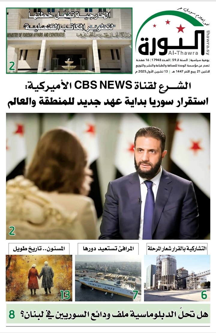 صحيفة الثورة العدد 17948 الصحيفة PDF # صحيفة الثورة في 13 أكتوبر , 2025 بتوقيت دمشـــق Loading... Taking too long? Reload document | Open in new tab تحميل العدد كاملاً [3.52 MB] مشاركة المقال: FacebookTwitterWhatsAppTelegramFacebook MessengerLinkedinطباعة