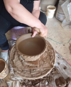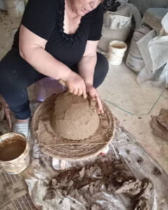 وتتابع: “نقوم بعد ذلك بإنجاز الأشكال الهندسية التي نريدها، ويسمى بهذه المرحلة مقلي فخار أخضر، قبل أن يجف.