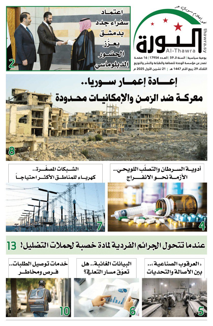 صحيفة الثورة العدد 17954 الصحيفة PDF # صحيفة الثورة في 21 أكتوبر , 2025 بتوقيت دمشـــق Loading... Taking too long? Reload document | Open in new tab تحميل العدد كاملاً [3.23 MB] مشاركة المقال: FacebookTwitterWhatsAppTelegramFacebook MessengerLinkedinطباعة