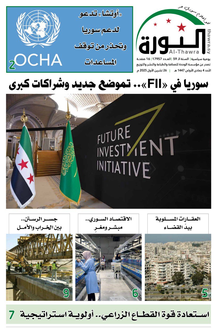 صحيفة الثورة العدد 17957 الصحيفة PDF # صحيفة الثورة في 26 أكتوبر , 2025 بتوقيت دمشـــق Loading... Taking too long? Reload document | Open in new tab تحميل العدد كاملاً [3.02 MB] مشاركة المقال: FacebookTwitterWhatsAppTelegramFacebook MessengerLinkedinطباعة