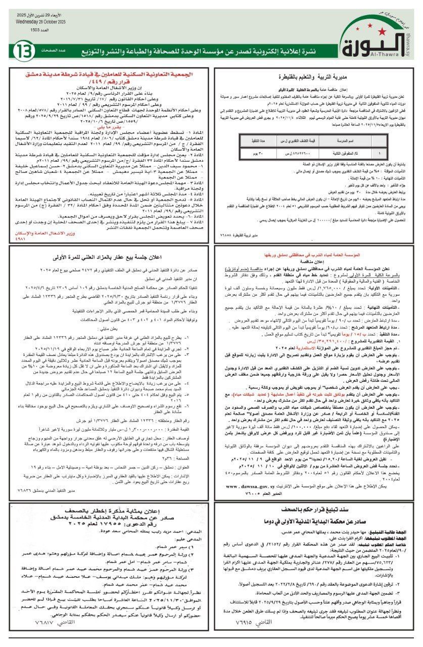 اعلانات العدد 1503 الاعلانات pdf # صحيفة الثورة في 29 أكتوبر , 2025 بتوقيت دمشـــق Loading... Taking too long? Reload document | Open in new tab تحميل العدد كاملاً [6.36 MB] مشاركة المقال: FacebookTwitterWhatsAppTelegramFacebook MessengerLinkedinطباعة