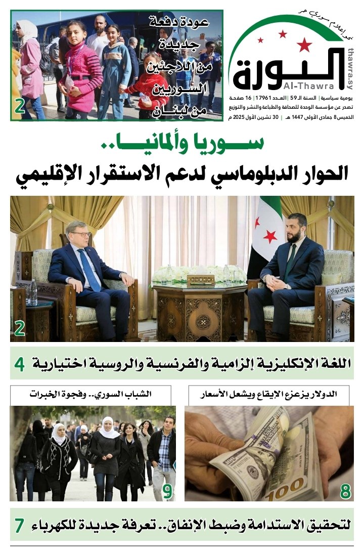 صحيفة الثورة العدد 17961 الصحيفة PDF # صحيفة الثورة في 30 أكتوبر , 2025 بتوقيت دمشـــق Loading... Taking too long? Reload document | Open in new tab تحميل العدد كاملاً [3.23 MB] مشاركة المقال: FacebookTwitterWhatsAppTelegramFacebook MessengerLinkedinطباعة
