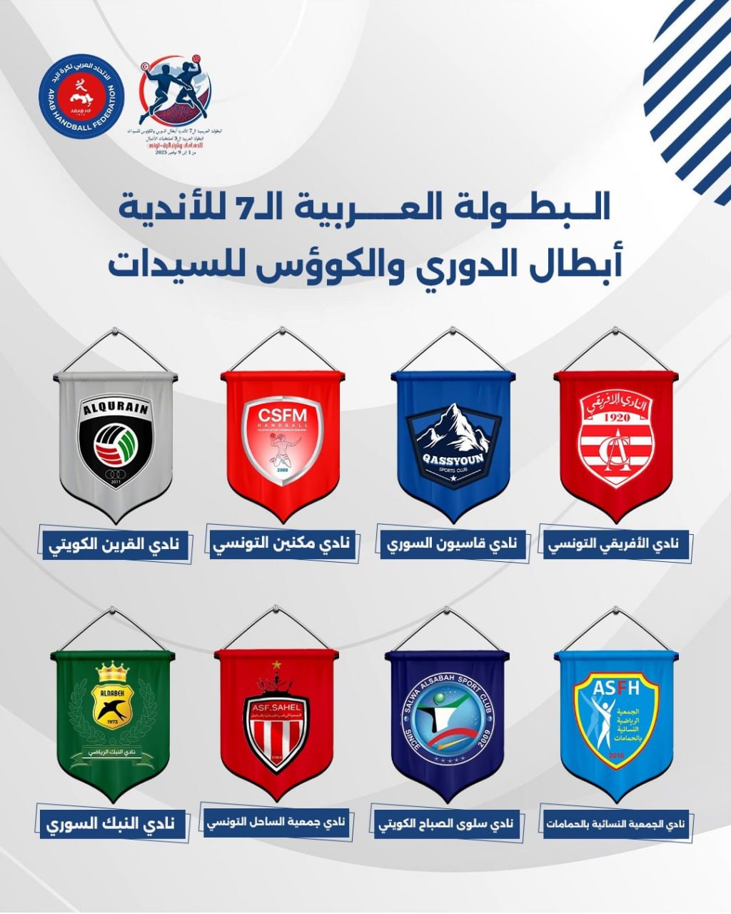 تنطلق اليوم السبت، النسخة السابعة من البطولة العربية للأندية أبطال الدوري والكؤوس لكرة اليد للسيدات، في ضيافة مدينة الحمامات التونسية، حتى التاسع من تشرين الثاني المقبل، بمشاركة ثمانية أندية، من ثلاث دول هي: تونس والكويت وسوريا، وستشكل تونس نصف الأندية المشاركة مقابل فريقين من الكويت، فيما تمثل سوريا فريقي قاسيون والنبك.