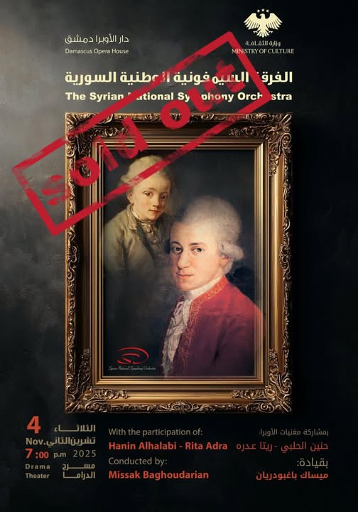 مرة أخرى تمهر عبارة “نفدت البطاقات – sold out” بوستر أمسية موسيقية تحييها الفرقة السيمفونية الوطنية السورية بقيادة المايسترو ميساك باغبودريان، وما يميز الأمسية اليوم أنها تستضيف أعمالاً للمؤلف الموسيقي النمساوي “لفغانغ أماديوس موزرات”.