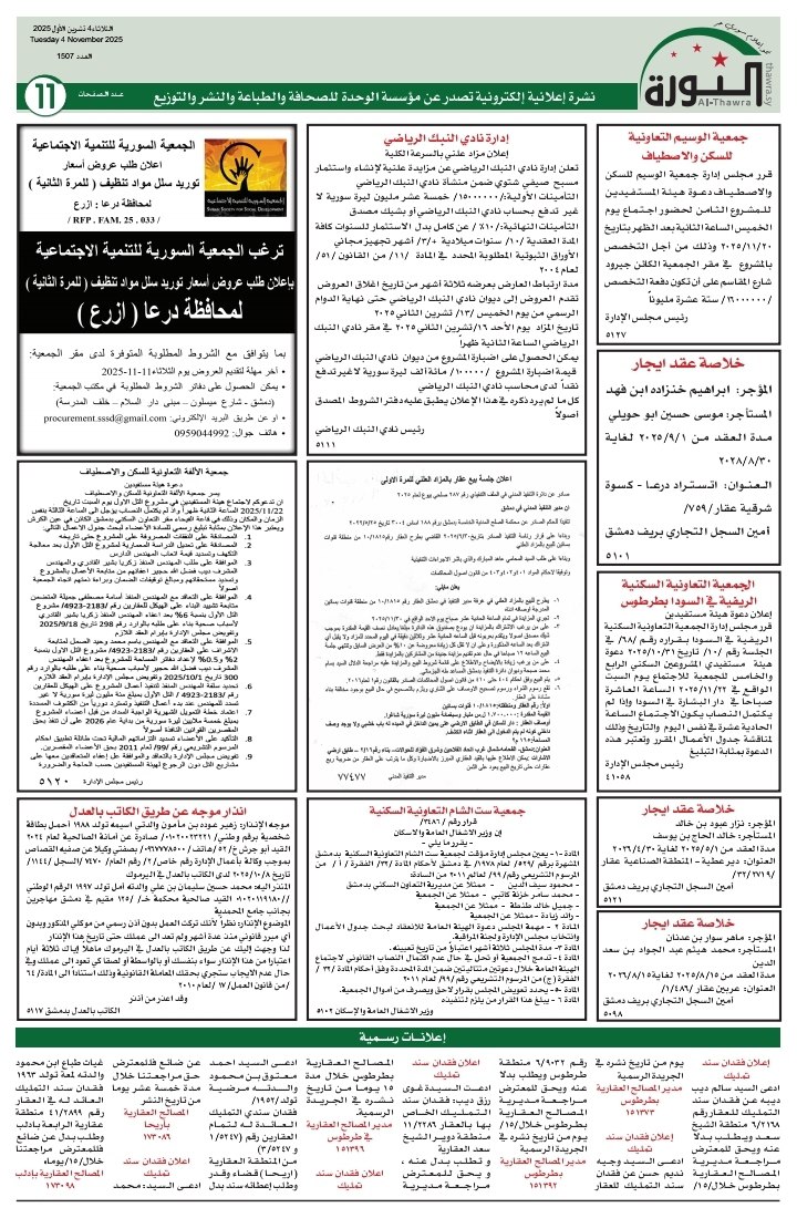 إعلانات العدد 1507 الاعلانات pdf # صحيفة الثورة في 4 نوفمبر , 2025 بتوقيت دمشـــق Loading... Taking too long? Reload document | Open in new tab تحميل العدد كاملاً [5.88 MB] مشاركة المقال: FacebookTwitterWhatsAppTelegramFacebook MessengerLinkedinطباعة
