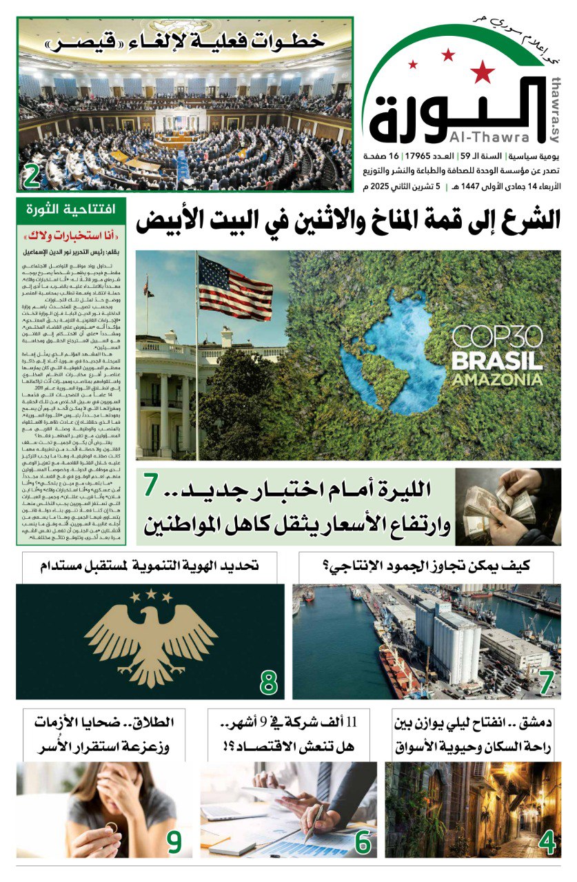 صحيفة الثورة العدد 17965 الصحيفة PDF # صحيفة الثورة في 5 نوفمبر , 2025 بتوقيت دمشـــق Loading... Taking too long? Reload document | Open in new tab تحميل العدد كاملاً [3.22 MB] مشاركة المقال: FacebookTwitterWhatsAppTelegramFacebook MessengerLinkedinطباعة