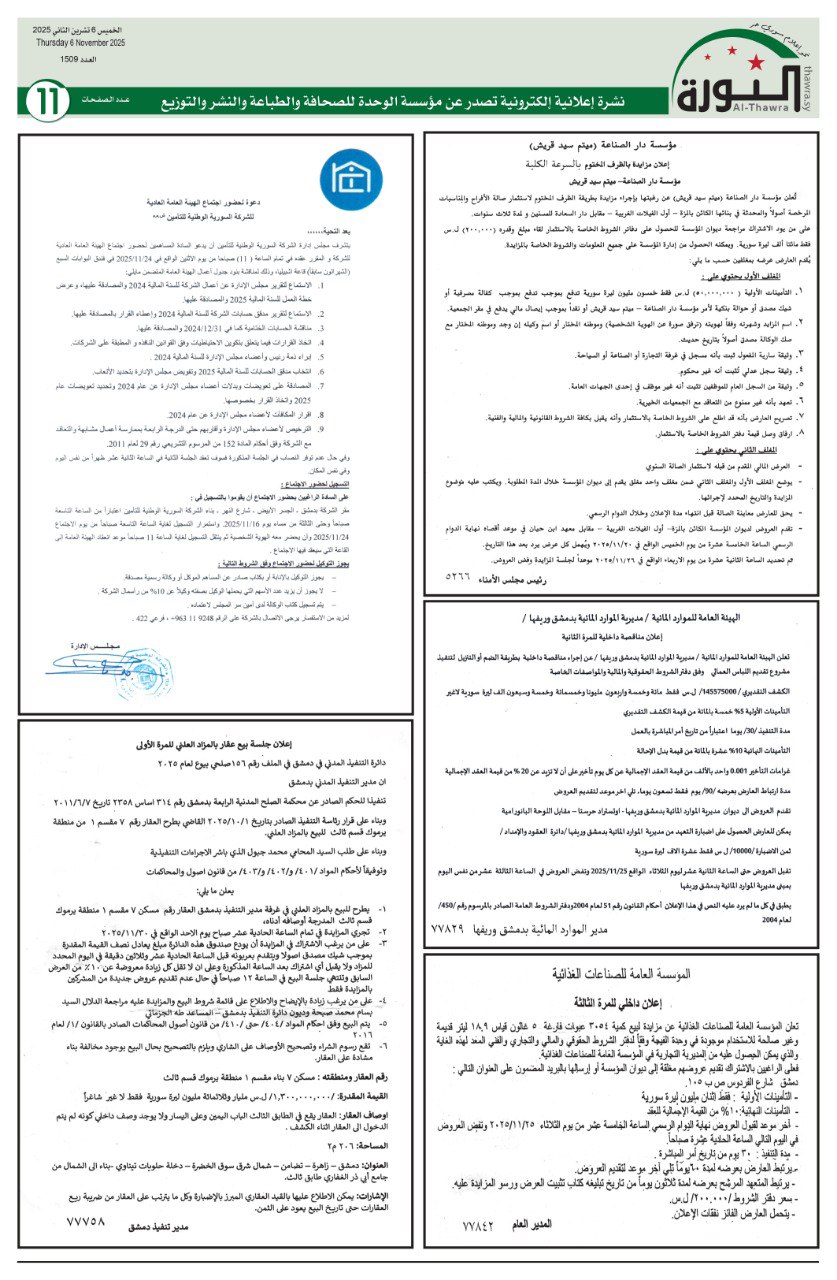 إعلانات العدد 1509 الاعلانات pdf # صحيفة الثورة في 6 نوفمبر , 2025 بتوقيت دمشـــق Loading... Taking too long? Reload document | Open in new tab تحميل العدد كاملاً [4.69 MB] مشاركة المقال: FacebookTwitterWhatsAppTelegramFacebook MessengerLinkedinطباعة
