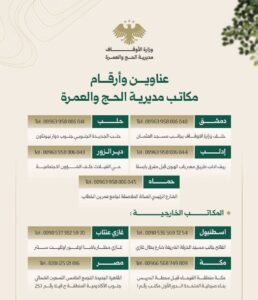 وجاء البيان مع اقتراب موعد وشروط تسجيل حجاج الجمهورية العربية السورية لموسم الحج، وانطلاقاً من الحرص على حماية الحجاج وضمان سير إجراءات التسجيل لموسم الحج وفق المعايير والضوابط النظامية والتعليمات الرسمية. ربطاً مع الخبر صورة عن عناوين وأرقام مكاتب مديرية الحج والعمرة.