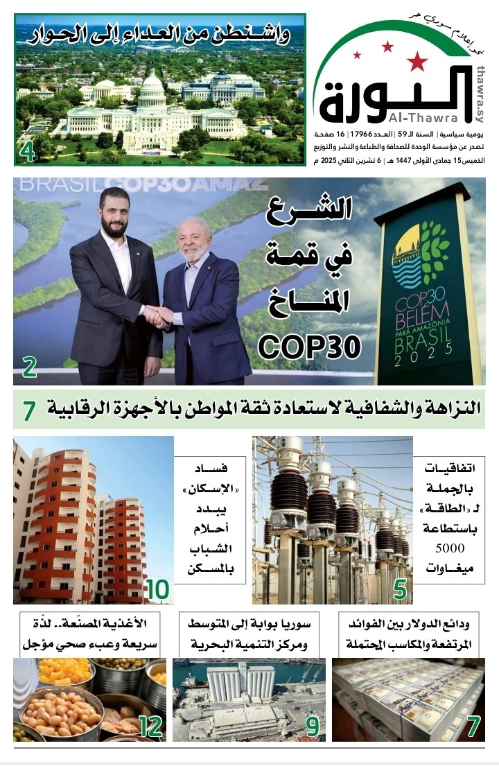 صحيفة الثورة العدد 17966 الصحيفة PDF # صحيفة الثورة في 6 نوفمبر , 2025 بتوقيت دمشـــق Loading... Taking too long? Reload document | Open in new tab تحميل العدد كاملاً [3.29 MB] مشاركة المقال: FacebookTwitterWhatsAppTelegramFacebook MessengerLinkedinطباعة