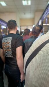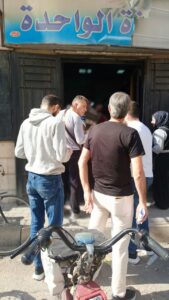 في خارج المبنی، مبنی شركة كهرباء حمص، (برّا) يتزاحم مئات المراجعين حول ثلاث أو أربع “برّاكيات”، صورة لاكتظاظ وتزاحم لا يليق بآدمية الإنسان.