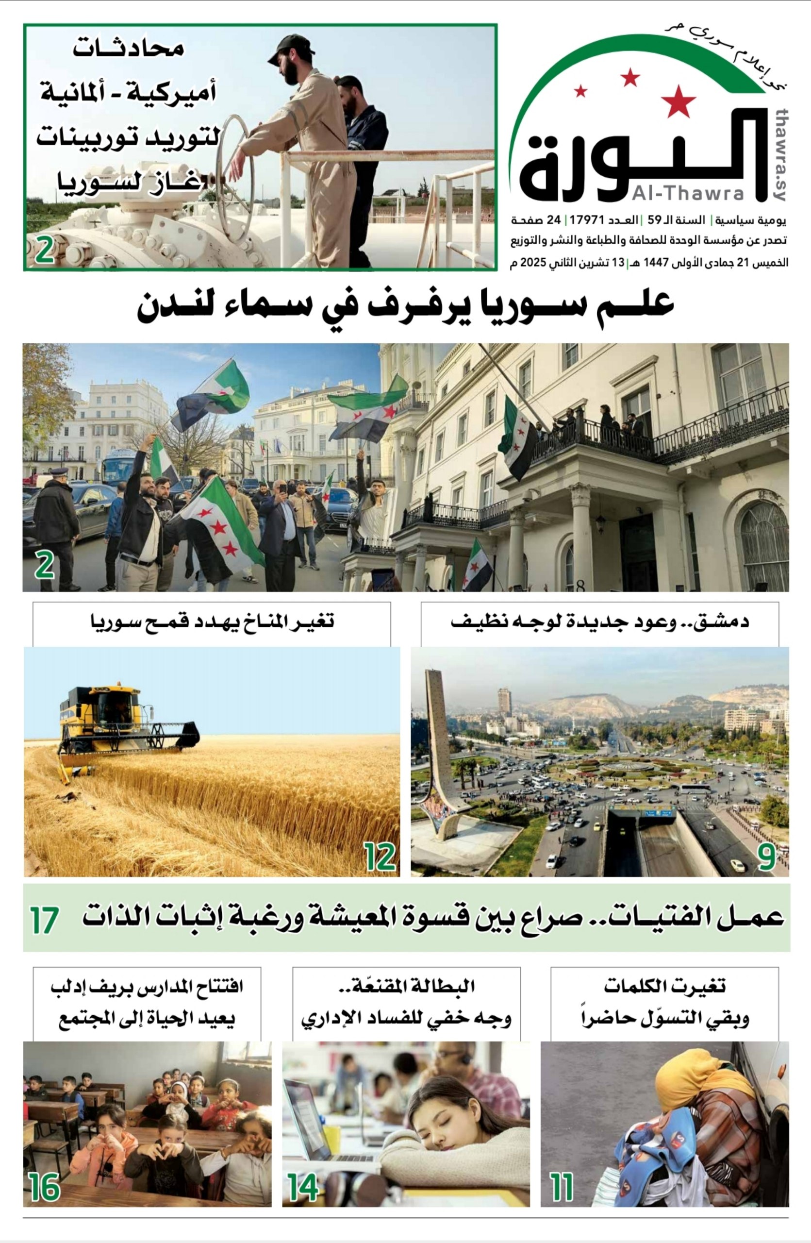صحيفة الثورة العدد 17971 الصحيفة PDF # صحيفة الثورة في 13 نوفمبر , 2025 بتوقيت دمشـــق Loading... Taking too long? Reload document | Open in new tab تحميل العدد كاملاً [5.44 MB] مشاركة المقال: FacebookTwitterWhatsAppTelegramFacebook MessengerLinkedinطباعة