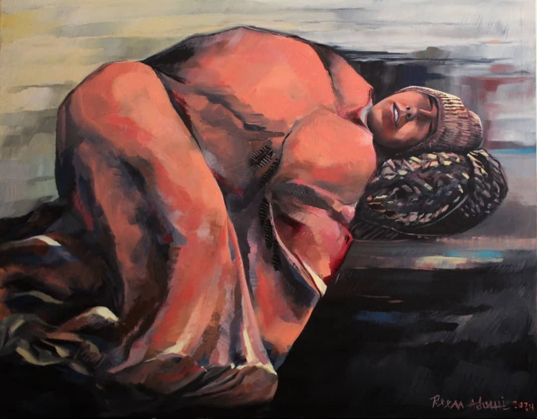 تصوّر لوحتها “الرصيف” طفلاً في سن المراهقة نائماً على الرصيف ومغطياً جسده بغطاء قماشي رقيق، بالكاد يوفر له الحماية من برد الليل.
