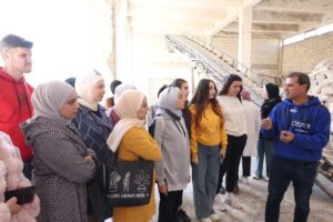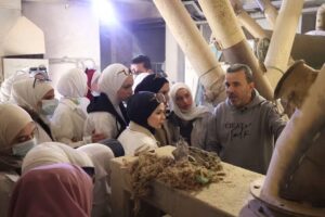 استهل الطلاب نشاطهم بزيارة إلى مطحنة الثورة المختصة بإنتاج الدقيق التمويني، حيث استقبلت إدارة المطحنة الوفد الطلابي وقدمت عرضاً حول آلية العمل وخطوط الإنتاج، واطلع الطلاب على مراحل التصنيع بدءاً من استلام الأقماح وإجراء التحاليل المخبرية لتحديد درجة القمح عبر اختبارات الوزن النوعي ونسب الأجرام والشوائب، وصولاً إلى مراحل التنظيف والترطيب والتخمير.