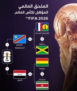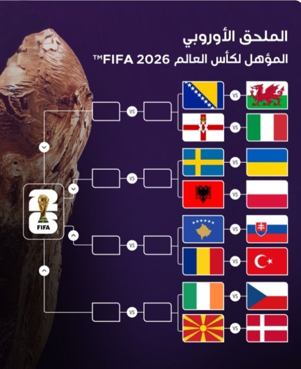 سُحبت اليوم الأربعاء، في مقر الاتحاد الدولي لكرة القدم الفيفا، بزيوريخ السويسرية، قرعة الملحقين العالمي والأوروبي، المؤهلين لنهائيات كأس العالم (2026) التي ستقام الصيف القادم، في كل من الولايات المتحدة الأمريكية وكندا والمكسيك، حيث أسفرت القرعة عمايلي: