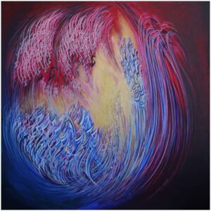 وينتقل في لوحته الثانية نحو فضاء أكثر حرية وانسياباً، حيث تتوزع الحروف على إيقاع بصري أشبه بالموسيقى. ويضيف غنّوم: “اعتمدت فيها الألوان الزيتية والأكريليك لإيجاد دينامية لونية متدرجة، مع لمسات ذهبية ترمز للطاقة الداخلية، لتمنح الحروف شعوراً بالحركة المستمرة، كما تتجلى خصوصيتي في منح الحرف مساحة كاملة للتعبير عن ذاته”. وهنا تشعر كأن اللوحة تتنفس، والخطوط على السطح تروي قصة الفن وروح الحرف العربي، فتدعو العين والقلب للتفاعل مع كل نفحة من الإبداع، لتصبح تجربة حسية متكاملة، تلمس النبض الداخلي للفنان نفسه.