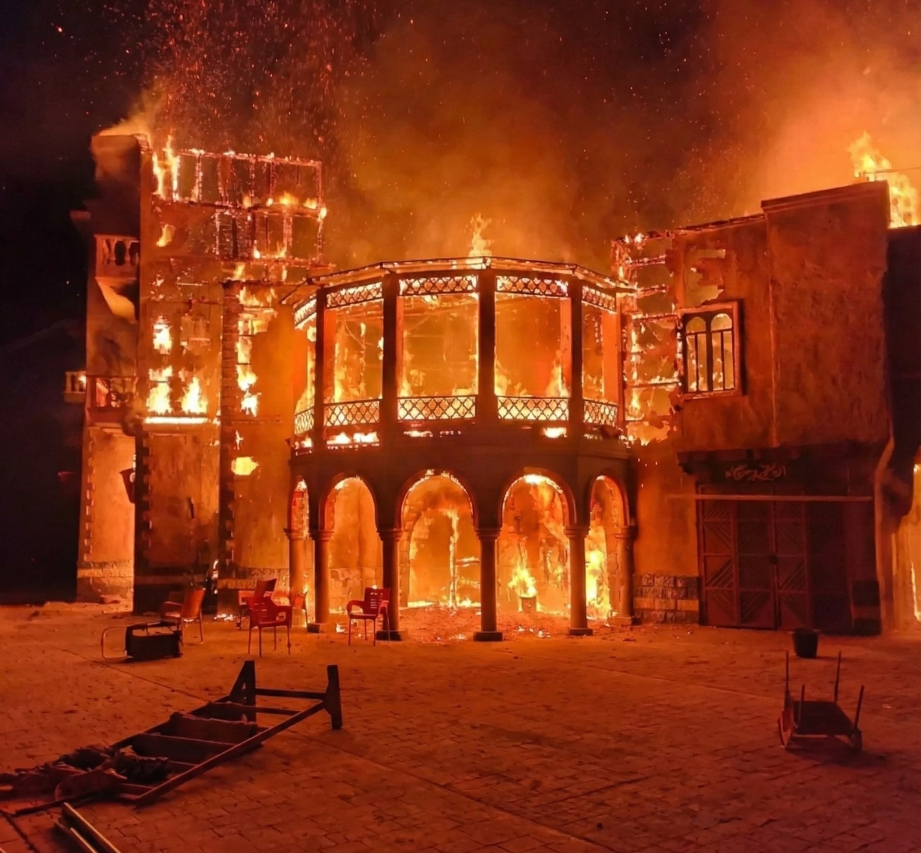 اتصال في منتصف الليل أعاد فريق الإنتاج والفنيين إلى موقع التصوير بعد أن أبلغهم “ابن الناطور” المكلّف بحماية الموقع بوجود حريق، وأنهم حاولوا إخماده دون جدوى، وصل مدير الإنتاج مع الفنيين، ووقف معهم أهالي بلدة كفرقوق إلى جانب عمال الإطفاء ليساعدوا في إخماد الحريق الذي استنزف أكثر من 30 سيارة إطفاء لتبرد ناره، فيما تم تسجيل خسائر كبيرة قدرت بـ “مليون ونصف” دولار أميركي، بحسب تصريح السيدة ديالا الأحمر للثورة.
