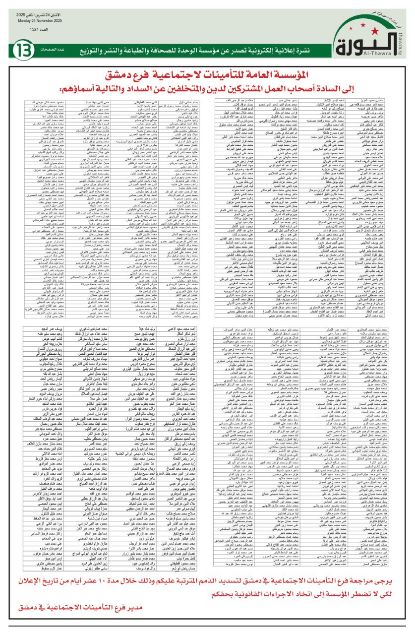 اعلانات العدد 1521 الاعلانات pdf # صحيفة الثورة في 24 نوفمبر , 2025 بتوقيت دمشـــق Loading... Taking too long? Reload document | Open in new tab تحميل العدد كاملاً [6.71 MB] مشاركة المقال: FacebookTwitterWhatsAppTelegramFacebook MessengerLinkedinطباعة