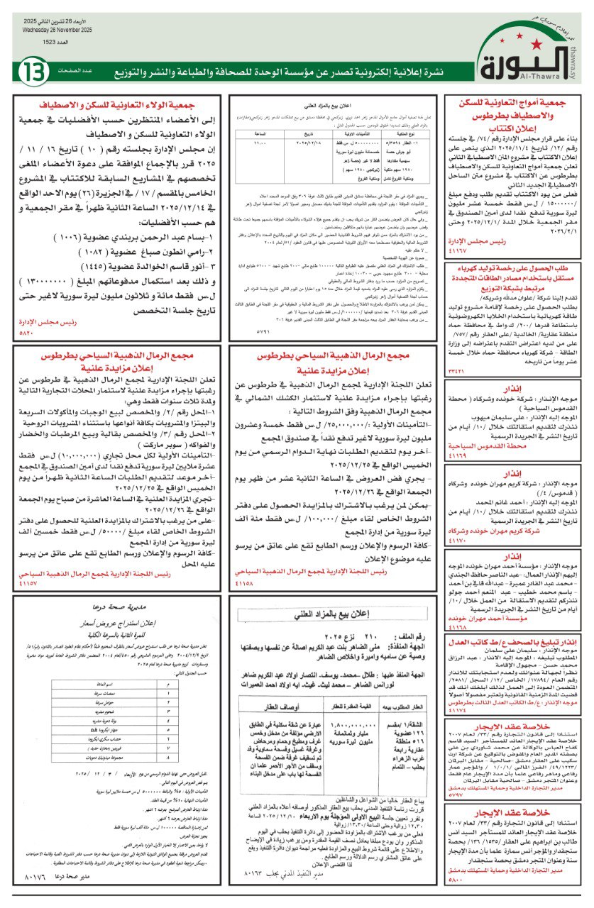 اعلانات العدد 1523 الاعلانات pdf # صحيفة الثورة في 26 نوفمبر , 2025 بتوقيت دمشـــق Loading... Taking too long? Reload document | Open in new tab تحميل العدد كاملاً [4.23 MB] مشاركة المقال: FacebookTwitterWhatsAppTelegramFacebook MessengerLinkedinطباعة