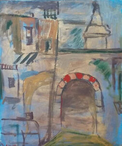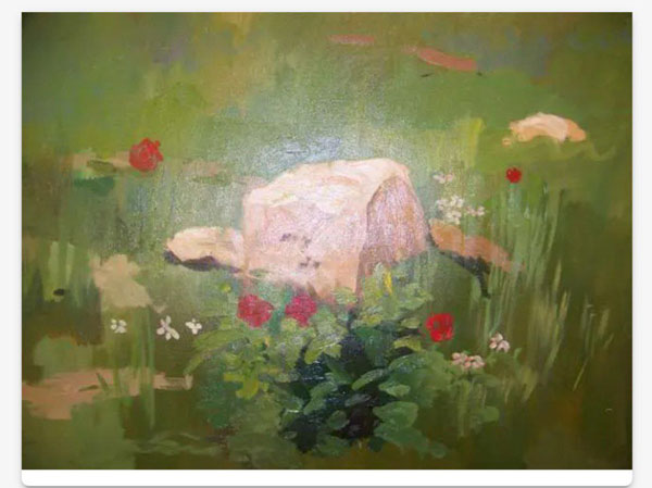 في إحدى لوحاته يستحضر القوس الحجري الدمشقي كرمز للذاكرة والحنين، وكأن العمارة تتحوّل إلى قصيدة بصرية، وإذا كانت العمارة لديه ذاكرة، فإن الطبيعة تصبح استعارة عن الجذور والصمود، وفي لوحته الثانية تظهر صخرة وسط عشب أخضر تتناثر حولها زهور حمراء وبيضاء، مشهد هادئ لكنه محمّل بالمعنى، يعكس حبه للأرض التي تمنح السوري قوة الحياة رغم تقلبات الزمن.