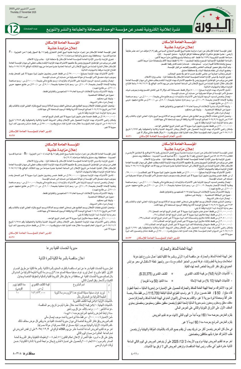 إعلانات العدد 1524 الاعلانات pdf # صحيفة الثورة في 27 نوفمبر , 2025 بتوقيت دمشـــق Loading... Taking too long? Reload document | Open in new tab تحميل العدد كاملاً [4.40 MB] مشاركة المقال: FacebookTwitterWhatsAppTelegramFacebook MessengerLinkedinطباعة
